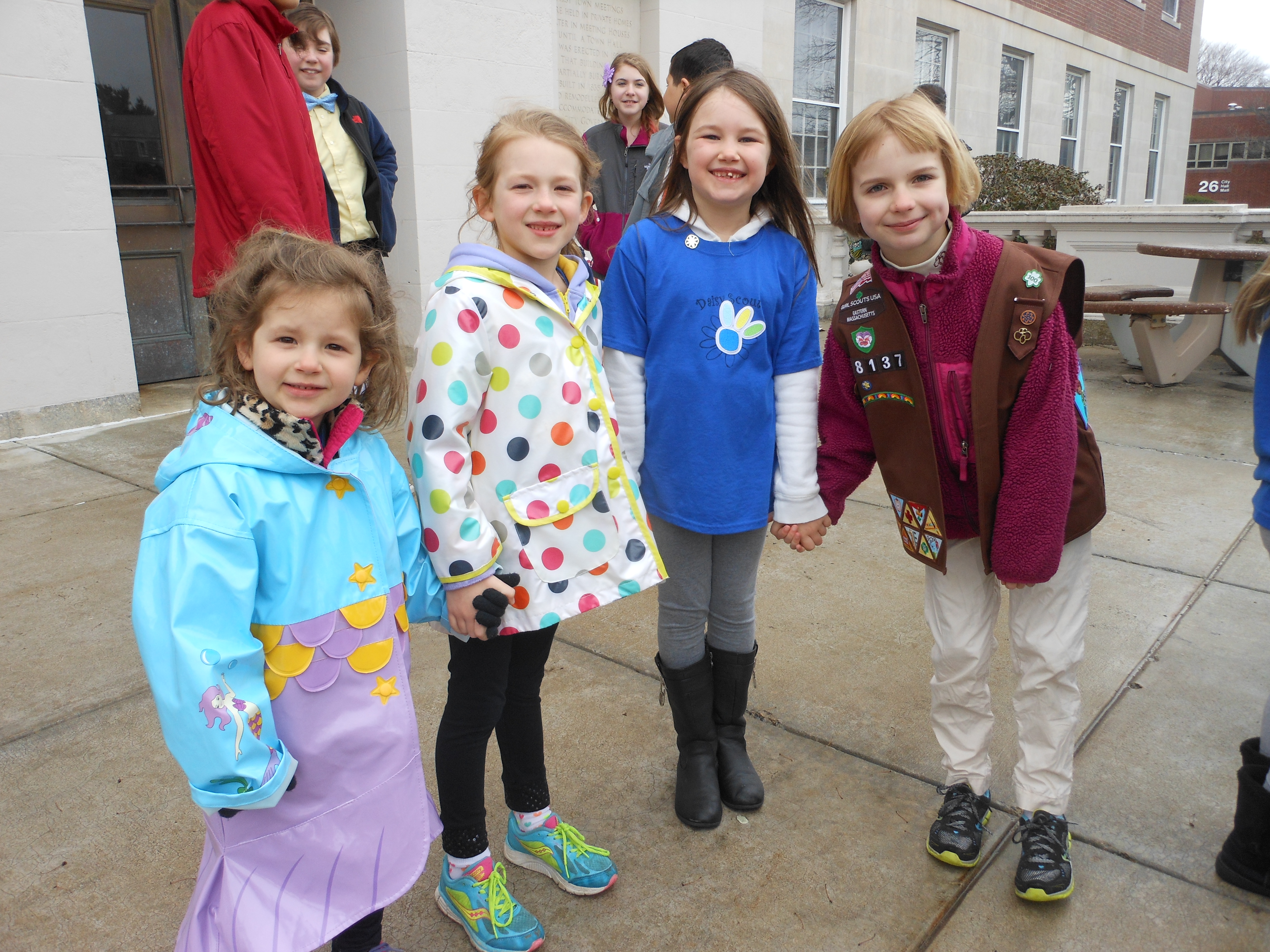 Daisies, Brownies, and Juniors participated in Medford’s Patriot’s Day Ceremony. The older girls paired up with the younger ones to march from City Hall to the Salem Street Burial Grounds in Medford Square. Once there, the girls recited the Pledge of Allegiance in unison. Thanks to all the girls, leaders, and their families for participating!