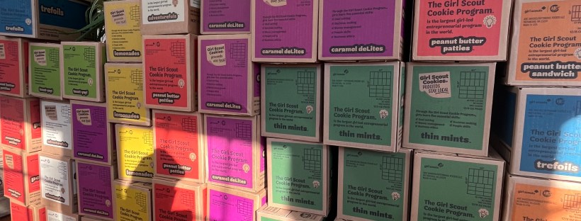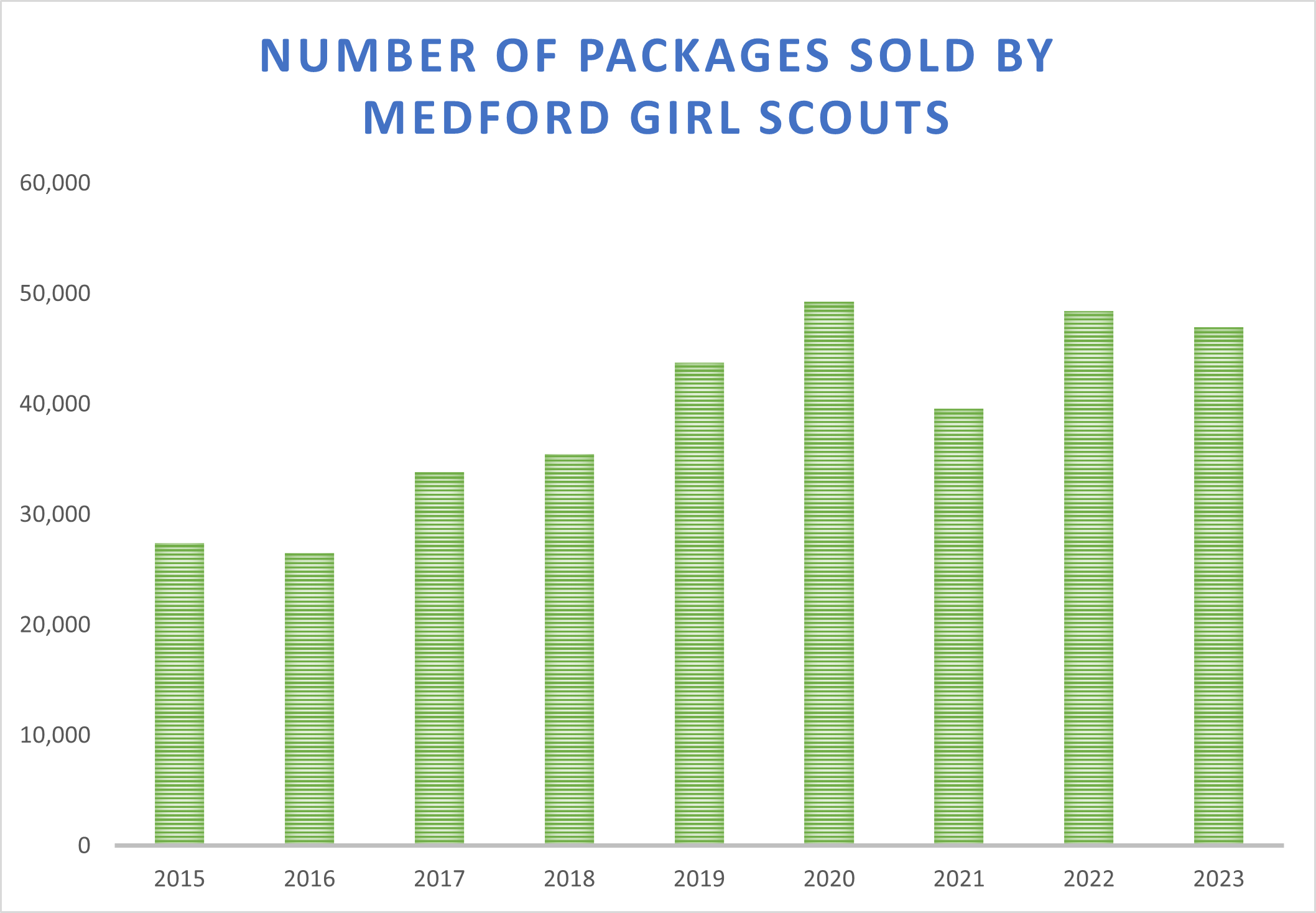Medford had another strong cookie sale season. 272 Medford Girl Scouts sold a grand total of 46,956 packages of cookies, and our average was up by 8% to 172 packages per Girl Scout. That’s a whopping $42,260 for Medford troops to use to for things like camping trips, service projects, field trips, and troop supplies.
