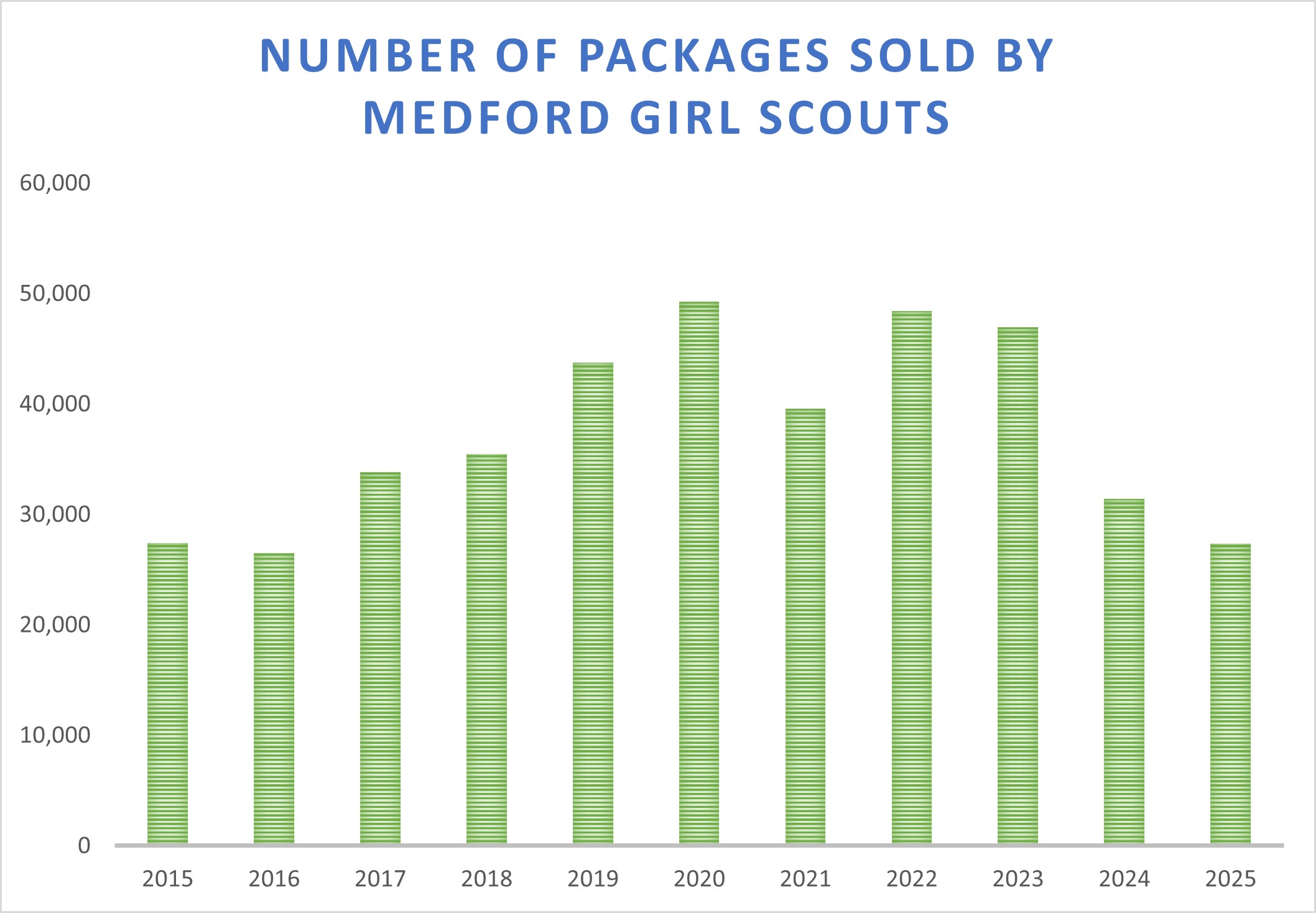 The 2024/25 cookie sale has wrapped up and, once again, Medford Girl Scouts were out in force. Selling an average of 150 packages of cookies each, 182 Medford Girls Scouts from 22 troops sold 27,359 packages in total at cookie booths, door-to-door, and to family and friends.