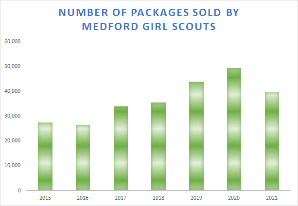 In total there were 244 Medford girls selling cookies this year for a grand total of 35,490 packages sold, which is more than Medford sold in the past three years.