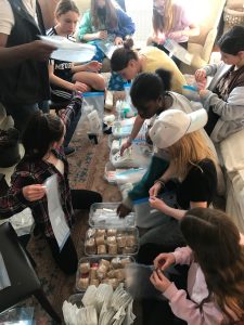 After the presentations, the girls sampled potato dumplings (varenyky), borscht, sweet tea biscuit (korovka), crepes, pickles, imported fruit juices of sour cherry and birch sap, and other Ukrainian foods and snacks. The girls then put together packets of medical supplies. With monetary donations and donations of supplies of Vinyl Gloves, Surgical Dressing, Butterfly Closures Strips, Band Aids, Gauze Pads, Alcohol Wipes, and Antibiotic Ointment, the troop assembled over 50 medical kits. The troop has partnered with Wellesley Girls Scouts to send a large quantity of medical kits to the Plast Ukrainian Scouting Organization. In working with the Wellesley Girl Scouts whose effort is being organized by second-generation Ukrainian and troop leader Tanya Lisowsky, these medical kits will be distributed across Ukraine to help the military and civilians. The troop learned of this project through a connection with Lucy Costa, the Wellesley Girl Scouts Service Unit Coordinator. Ms. Lisowsky has shared that these vacuum packed medical kits will be routed through New Jersey, then Poland, then onto Ukraine. Upon arrival in Ukraine, they will be routed via a “green corridor,” a defined area where there is safe passage of not only humanitarian aid, but civilians fleeing war.