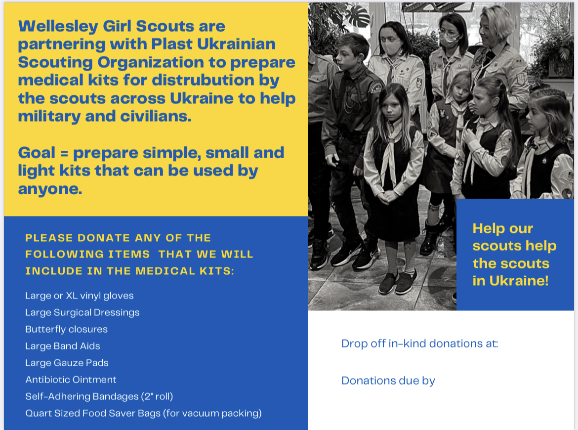 Ms. Lisowsky stated, “The Ukrainian scouts in both the United States and Ukraine are in a unique position to provide immediate support to troops and refugees. If you’d like to learn more about the Ukrainian scouting organization or donate to their efforts, please visit https://aid.plastusa.org. Another way to donate is to shop this amazon wishlist for supplies so that the Scouts in the Boston area can continue to make medical kits.”